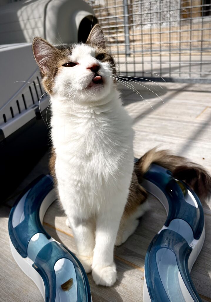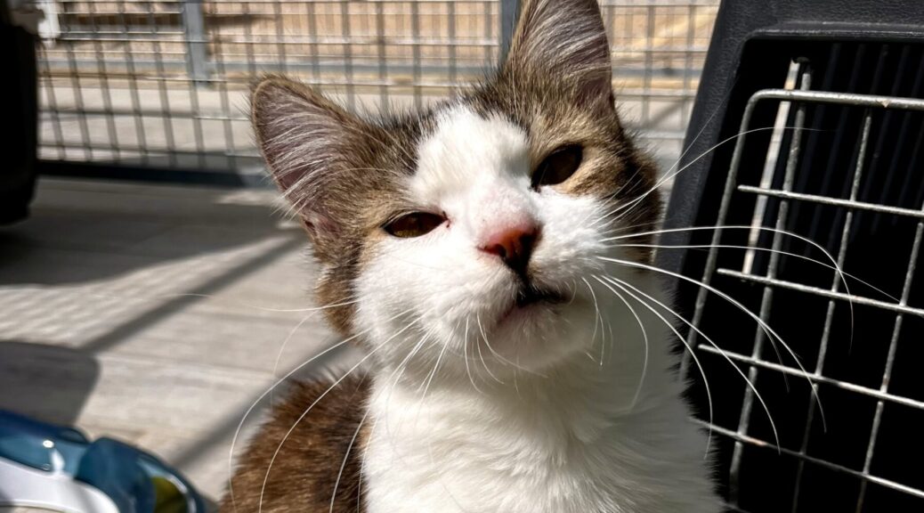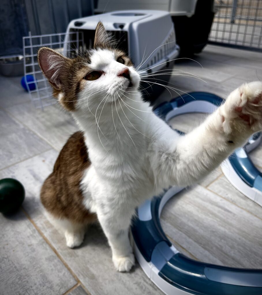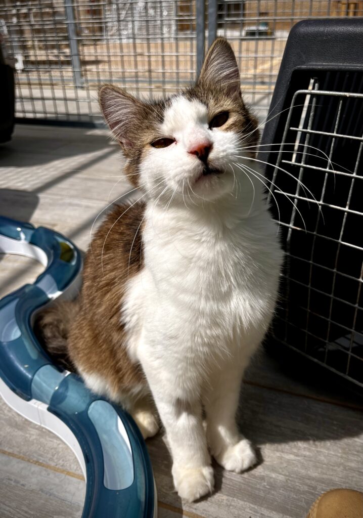Tika est une jeune minette, probablement la sœur d’Atlas, elle aussi marquée par un événement traumatisant. Nous sommes intervenus le lundi de Pâques suite à un appel de la gendarmerie : elle faisait partie des chats retrouvés enfermés dans une maison après le décès soudain de leur propriétaire, avec très peu de nourriture et d’eau.
